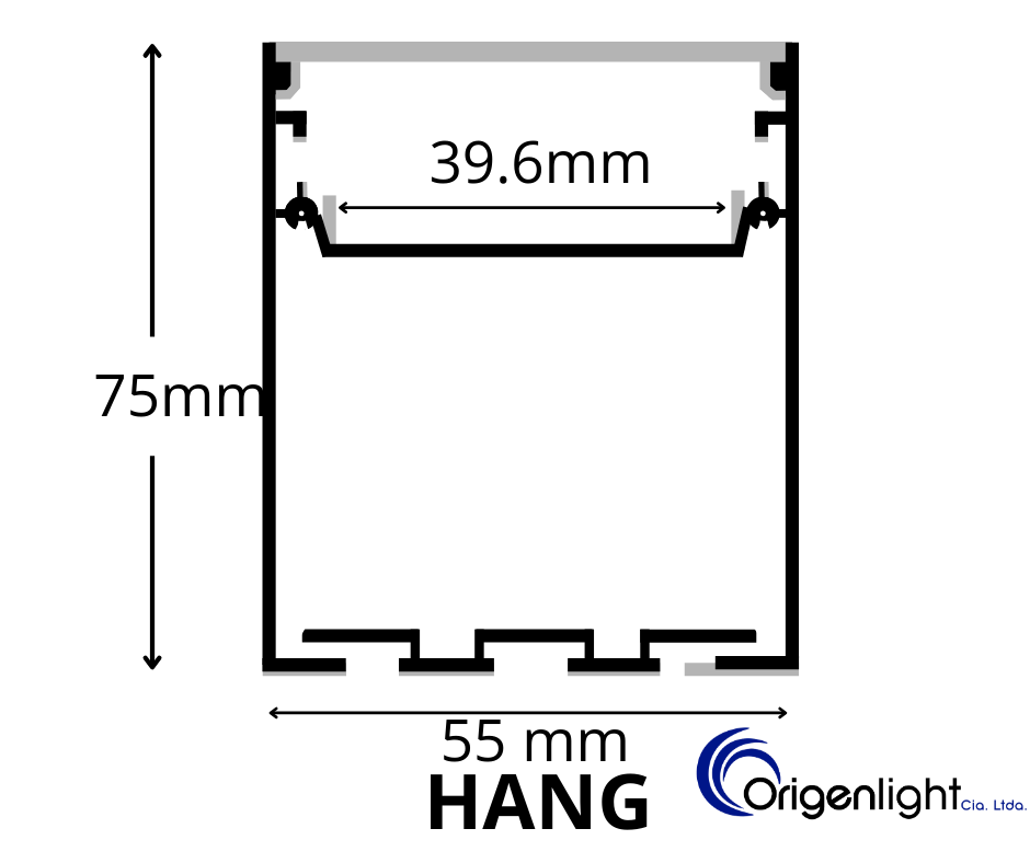 El perfil New Hang Narrow redefine la iluminación lineal. Con un diseño de solo 55 mm de ancho pero una profundidad de 75 mm, este perfil crea un impacto visual de solidez y minimalismo en negro profundo. Sus 3 metros de longitud permiten trazos de luz continuos y elegantes sin interrupciones, ideales para oficinas corporativas, lofts o locales comerciales de lujo.